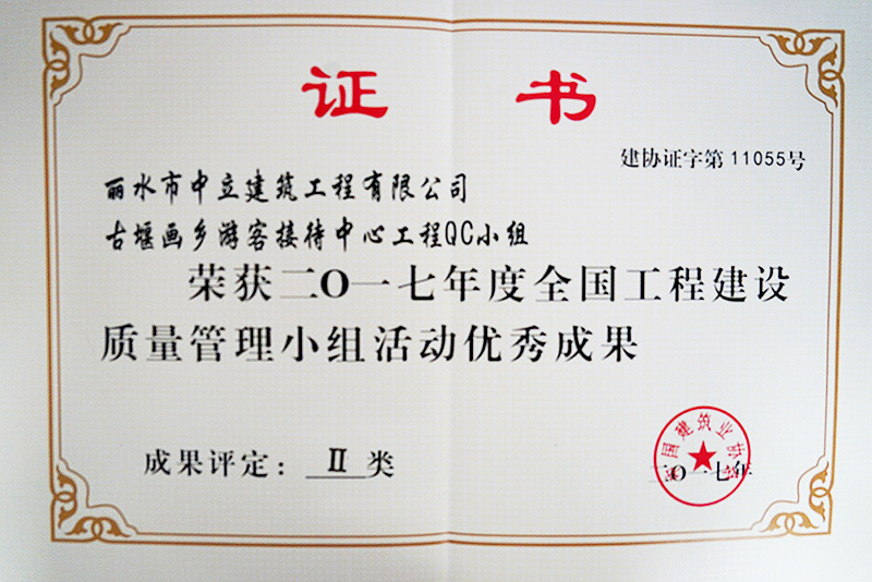 中國建筑業協會于2017年6月30日至7月4日在四川省成都市舉行2017年度全國工程建設優秀質量管理小組發布會,我公司古堰畫鄉游客接待中心工程QC小組的活動課題:“提高夯土墻飾面層質量合格率”被評為2017年全國工程建設優秀質量管理小組二等獎。